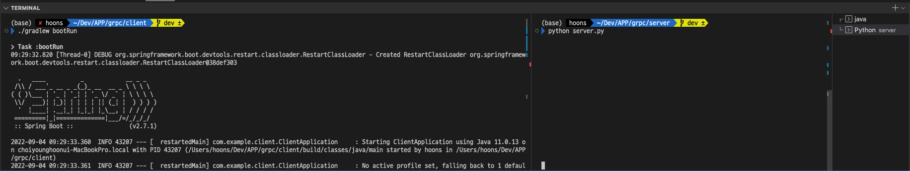 Client는 Spring boot를 사용하여 간단한 Rest server로 만든다. 사용자로 부터 Rest 호출을 받고 Python 서버와 gRPC를 통해 서비스 호출하는 프로세스를 구현한다.