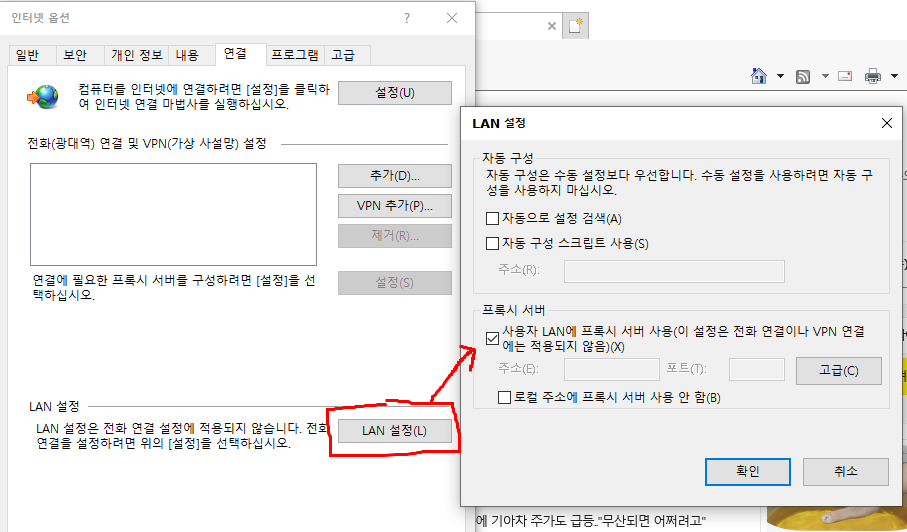 인터넷익스플로러 프록시 사용여부 확인 - 설정되어있는경우 해제 한다.